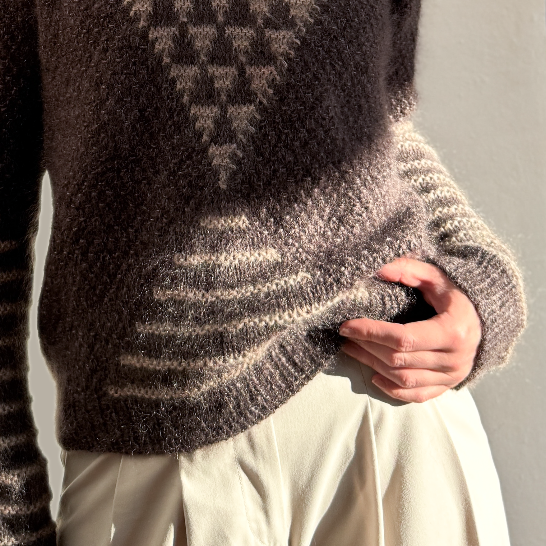 The sweater is worked top-down. First, stitches are cast on at the back of the neck and worked back and forth in stripes with increases for the shoulders. When the shoulders have reached their final width, double moss stitch is worked on the back until the armhole depth is reached. At the same time, a small triangle pattern in intarsia is formed in the center of the back.