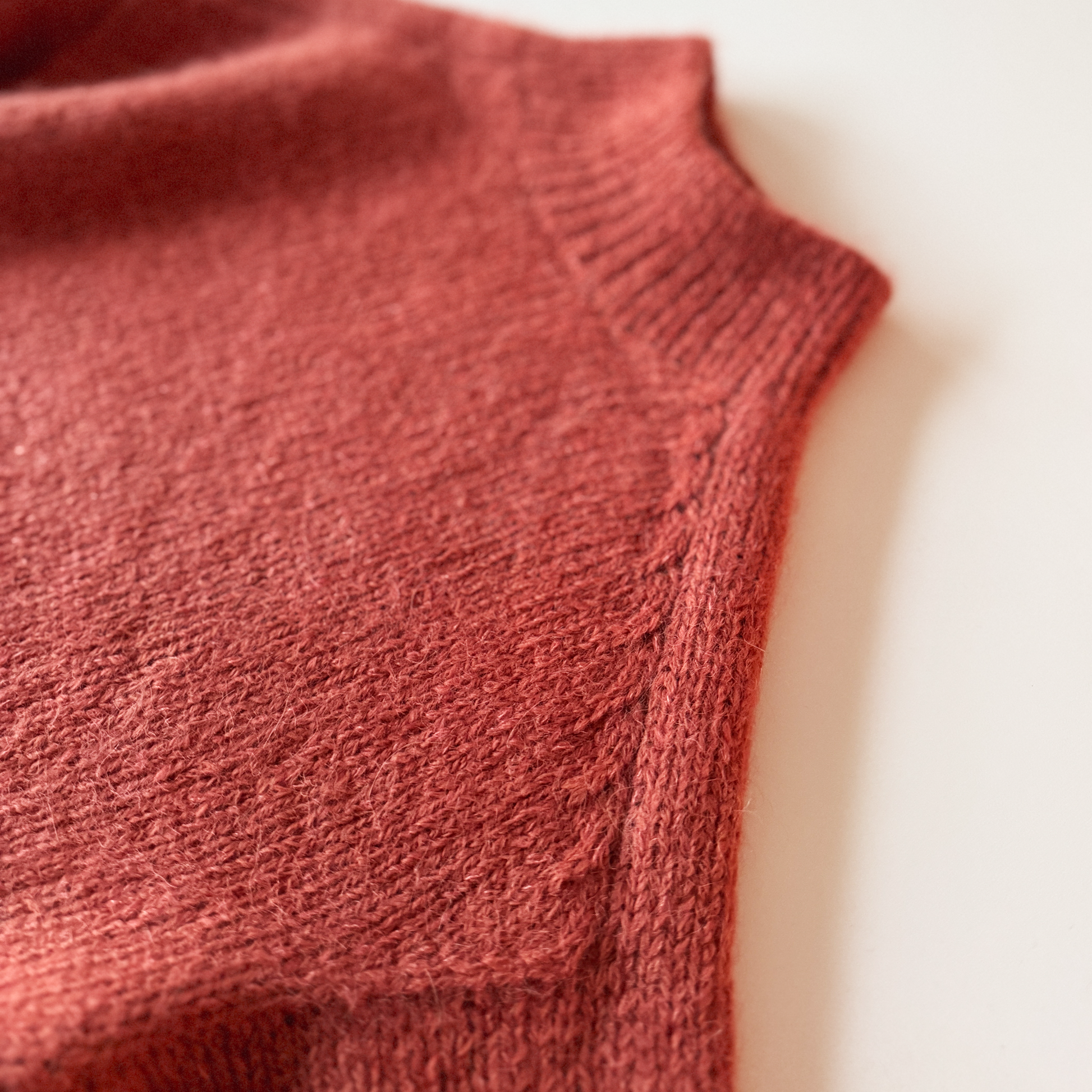 The work is joined again and worked in the round on the body and finished with a rib edge with slits in the sides.