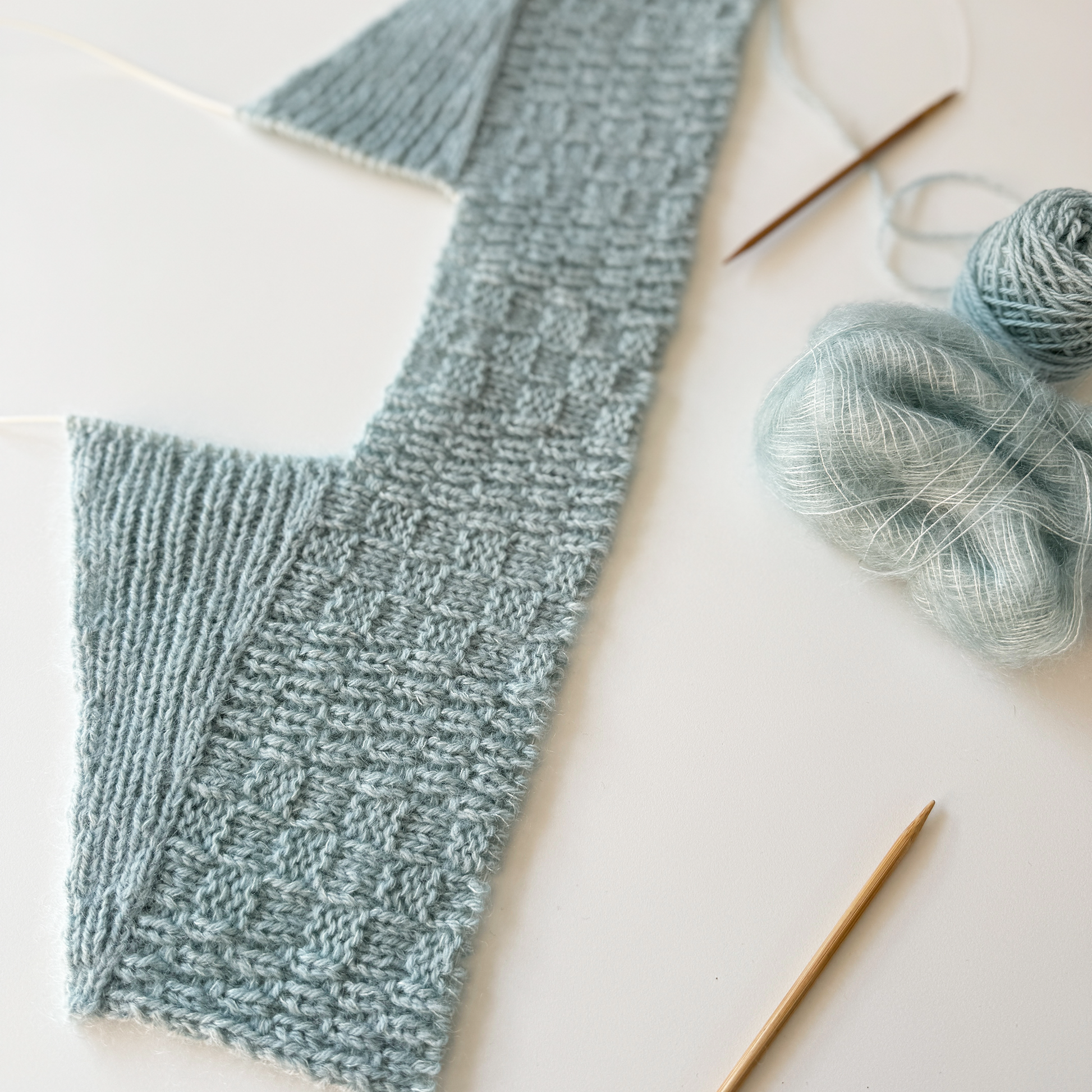 The sweater is worked top down. First, the two wedges are knitted separately and the stitches at the neck are put on hold. Stitches are then knitted up along one side of each wedge and stitches are cast on at the back of the neck.
