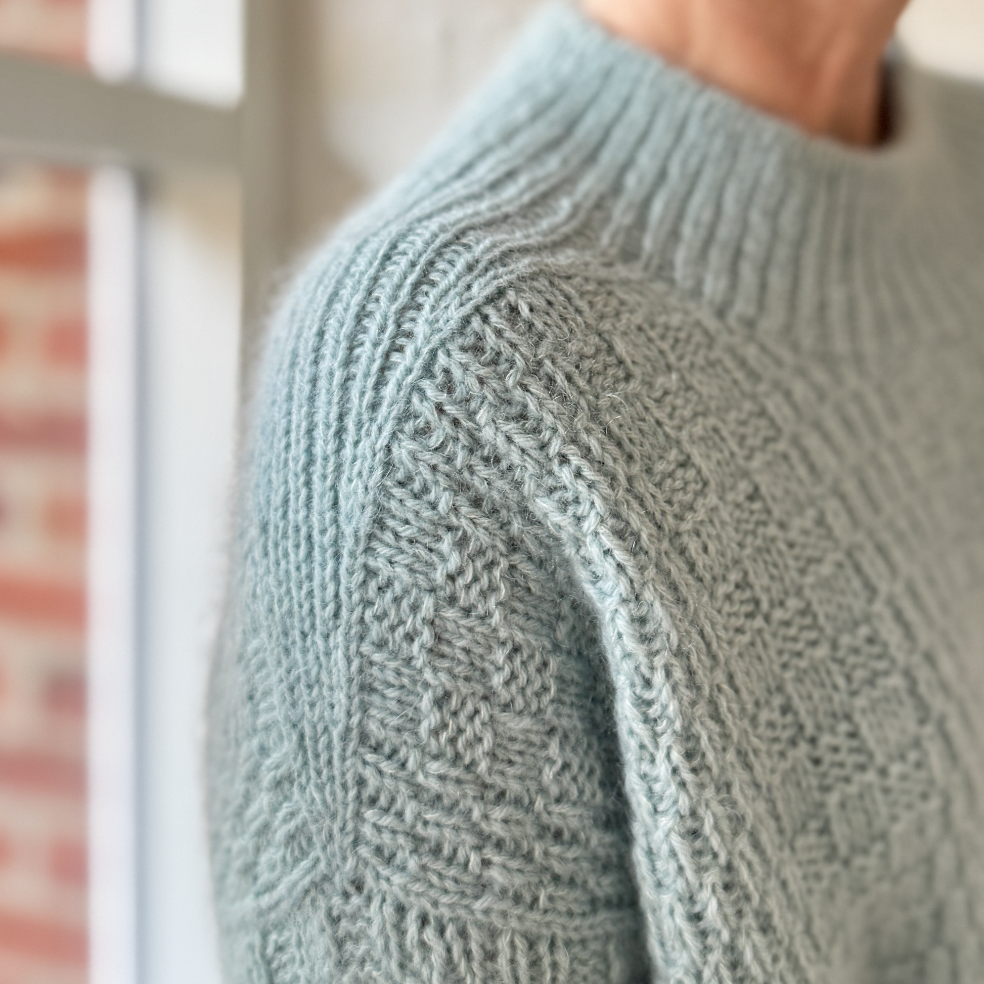The held stitches from the wedges are placed on the needle and stitches are knitted up along the rest of the neck opening. The collar is worked in rib with short rows to raise the back of the neck.