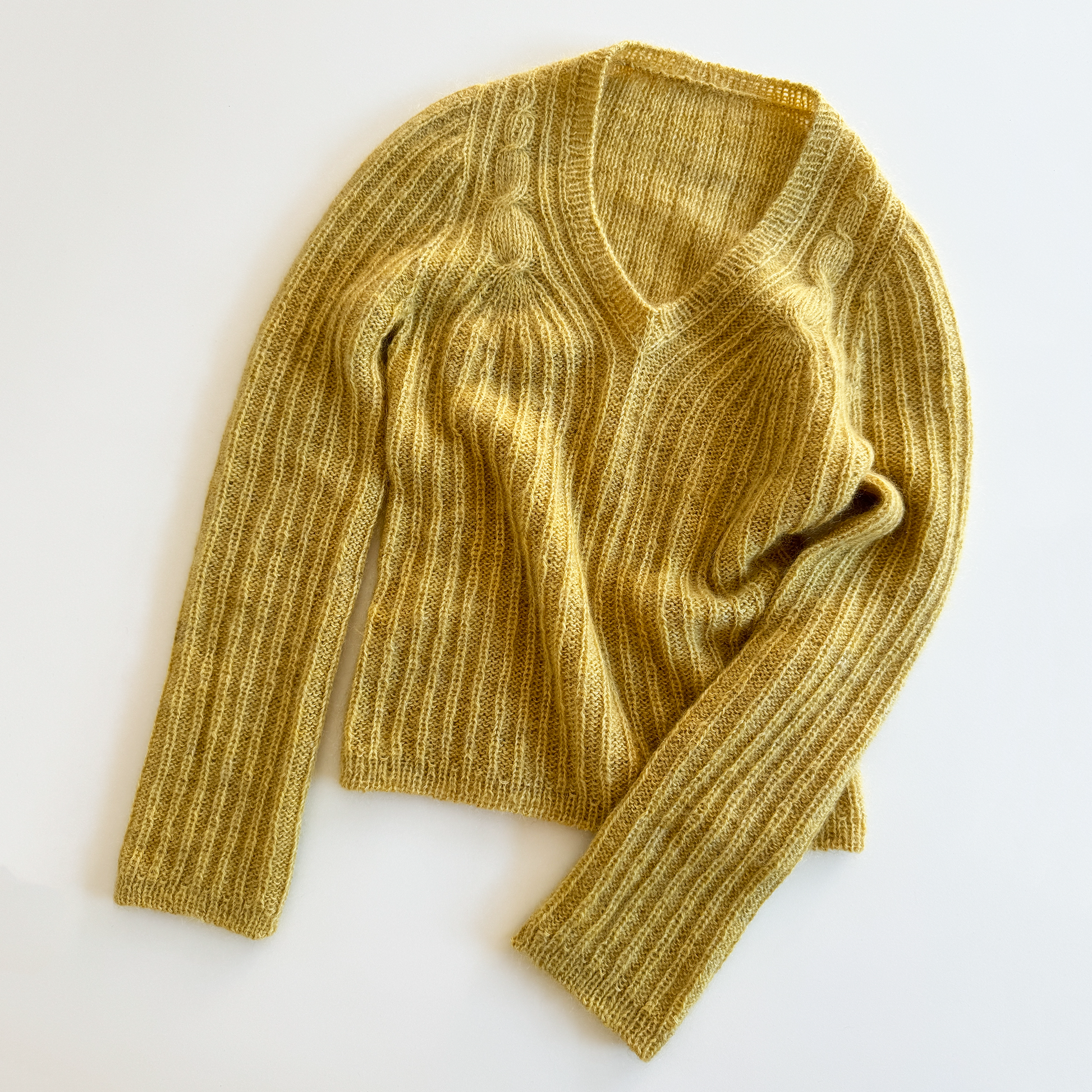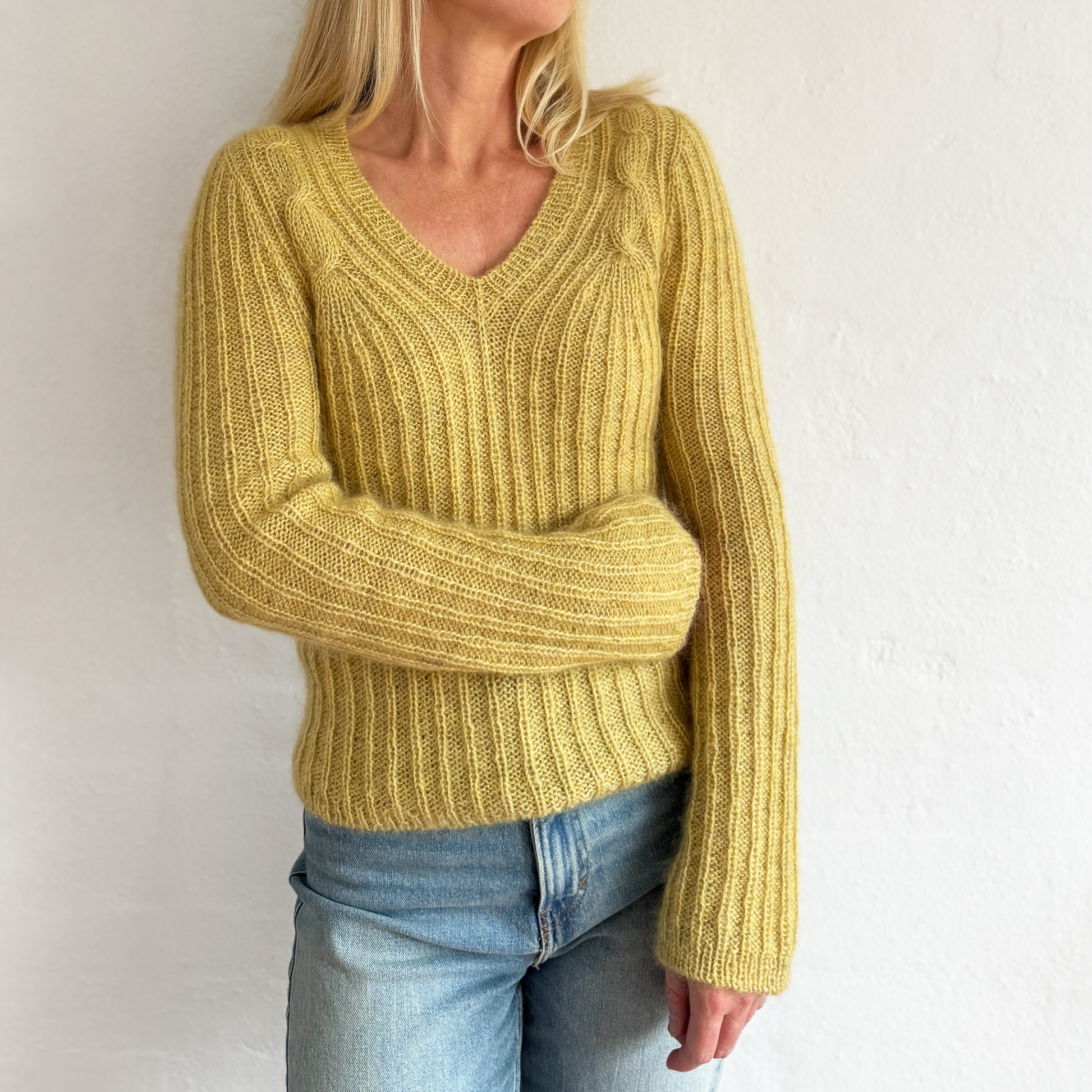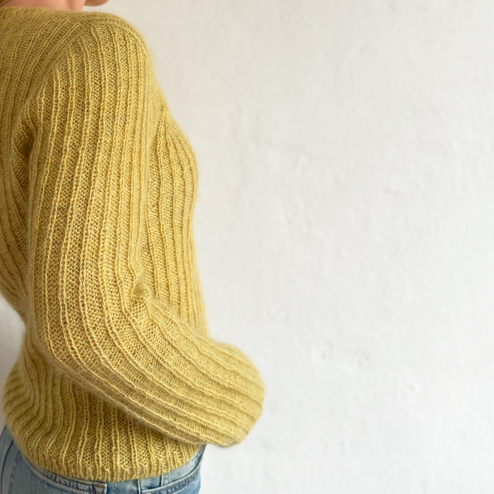 Gul: Highland, Hay og Silk Lace, 59 fra Isager - Størrelse XS vist på model med brystmål 85cm, med et negativt ease på -1cm.