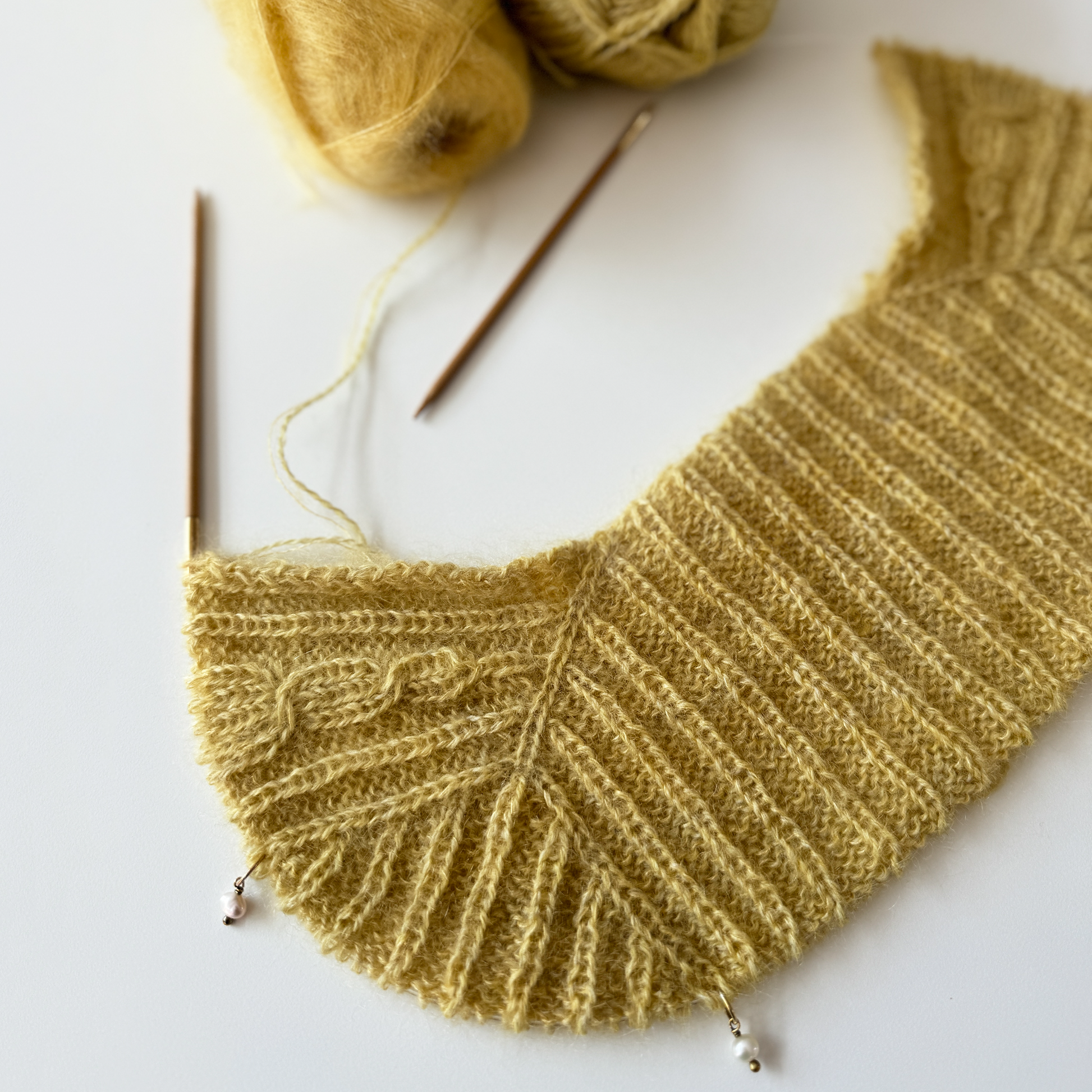 Først slåes masker op i halsen og der strikkes frem og tilbage i rib med udtagninger på skuldrene. Der strikkes ifølge diagram igennem hele opskriften. Opstarten er desuden beskrevet pind for pind.
